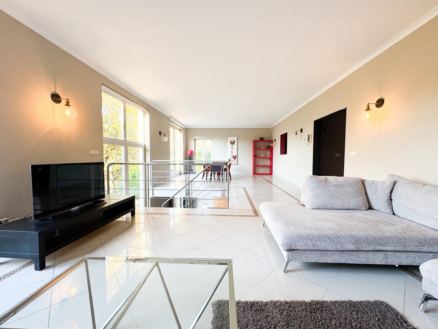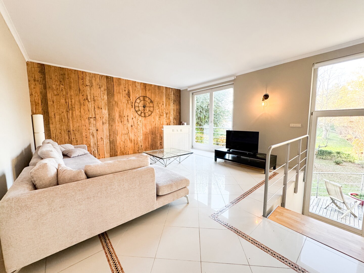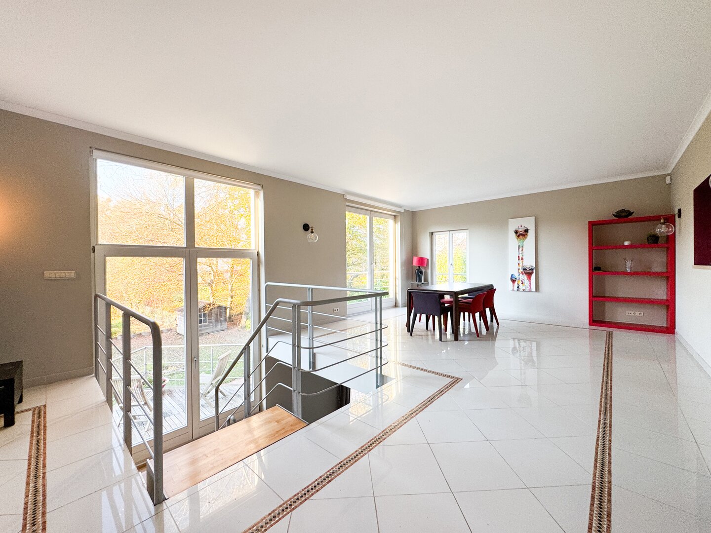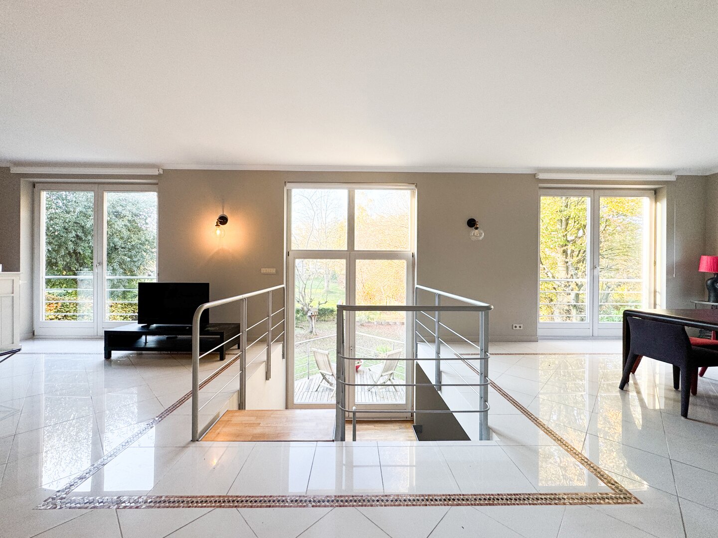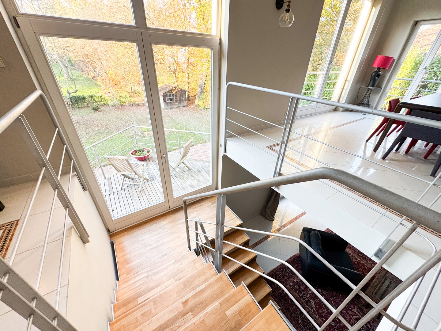 On the lower floor, a large multi-purpose room provides access to the garden.