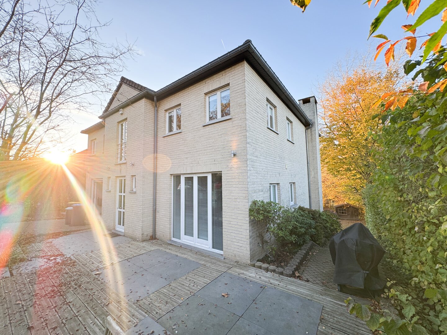 The house opens onto an entrance hall with a cloakroom and separate toilet. The spacious, light-filled living room includes a fully equipped open-plan kitchen.