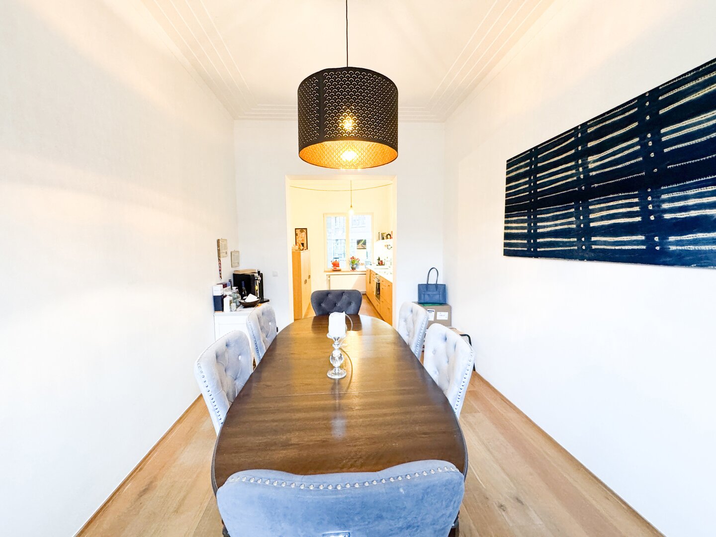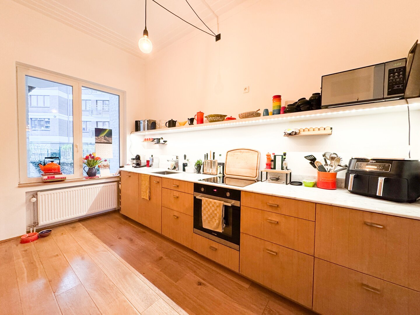 Situated on the ground floor of a small condominium, the apartment comprises an entrance hall, a stunning fully equipped kitchen with ample storage space, as well as a street-facing dining room.