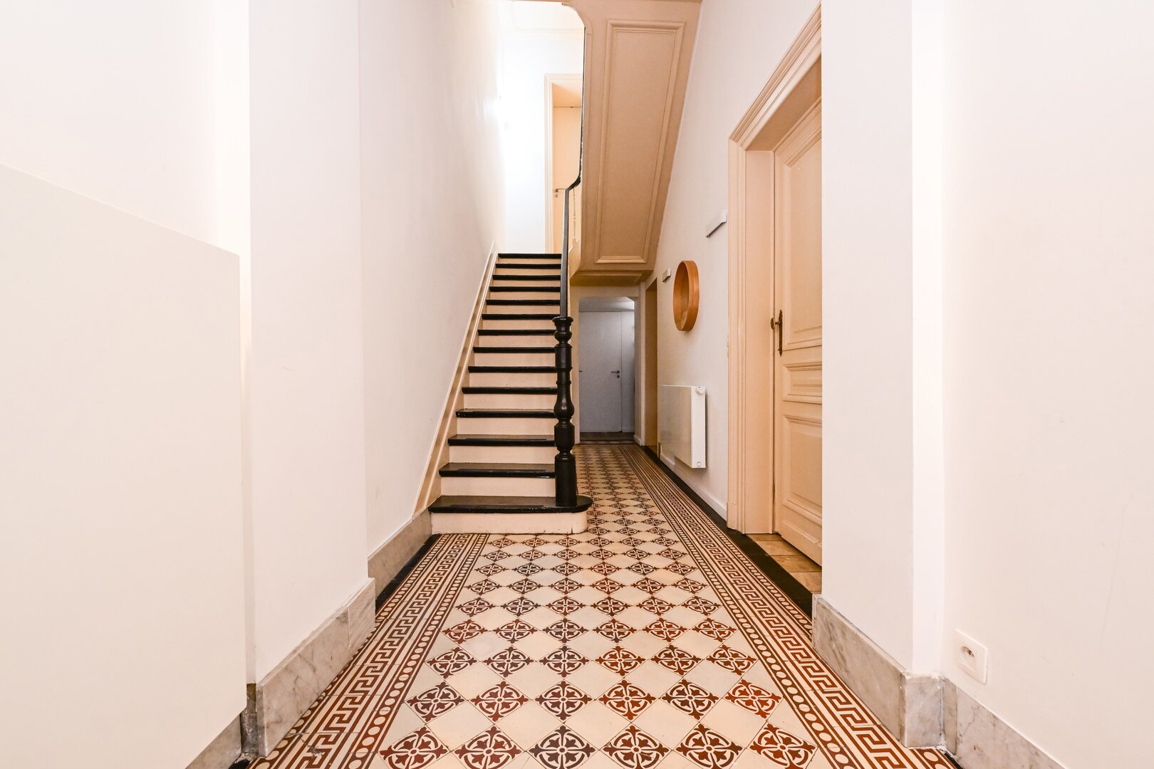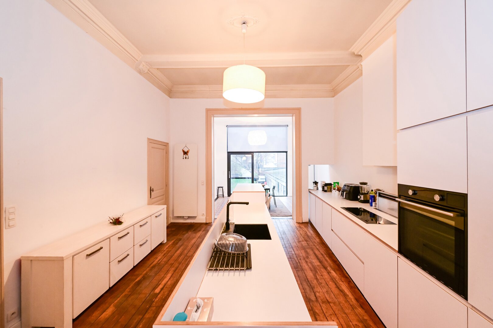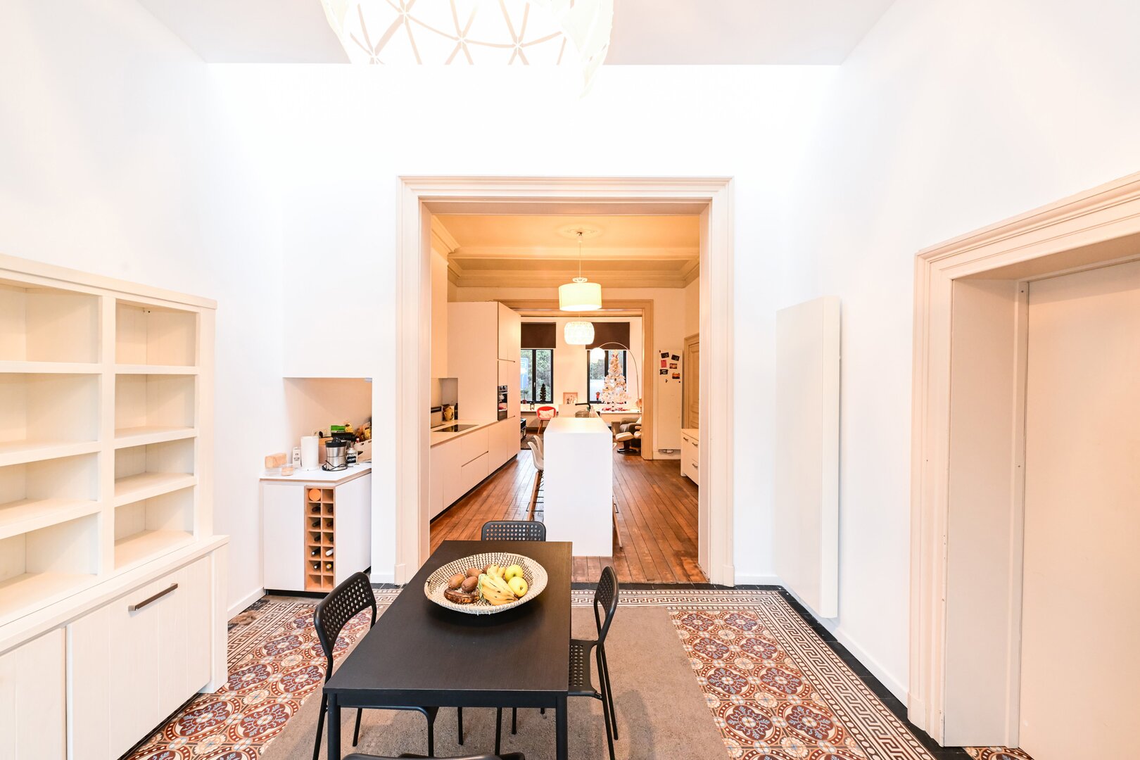 Dès l’entrée, vous serez séduit par un grand hall d’entrée avec un carrelage d’époque. Le salon lumineux, avec ses belles hauteurs sous plafond, ses moulures et son parquet, offre un espace chaleureux, ouvert sur une cuisine moderne super équipée, prolongée par la salle à manger, avec un accès direct au jardin de ± 200 m², orienté ouest. Au niveau intermédiaire, la maison dispose d’une spacieuse buanderie ainsi que d’une grande salle de bain avec douche et toilette.