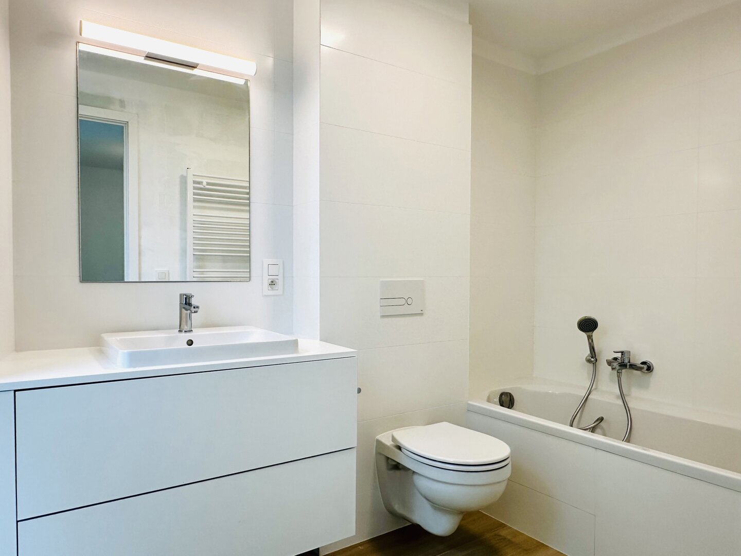 Deze flat is zorgvuldig ontworpen om aan je behoeften te voldoen. De lichte, ruime woonkamers zorgen voor een warme, gastvrije sfeer. De afwerking en inrichting zijn van de hoogste kwaliteit, zoals gekozen door U. Een volledig uitgeruste keuken, stijlvolle badkamer en praktische bergruimte maken integraal deel uit van deze flat. Er is ook een terras om te ontspannen na een lange dag.